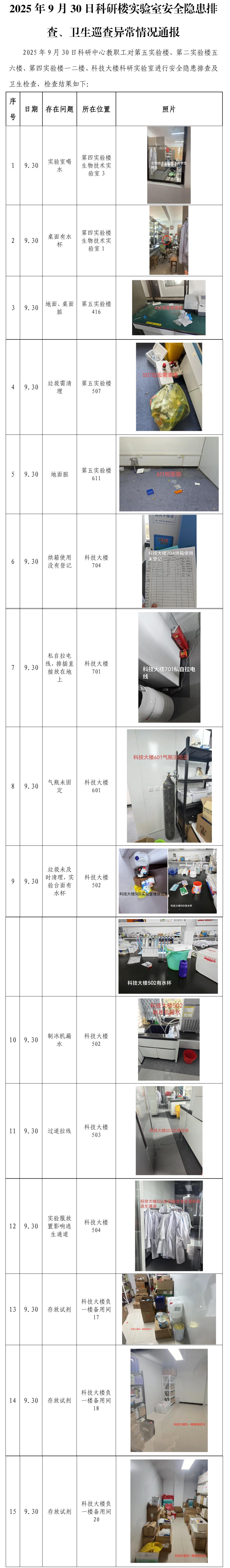 科研中心进行2025年9月30日科研楼实验室安全卫生巡查