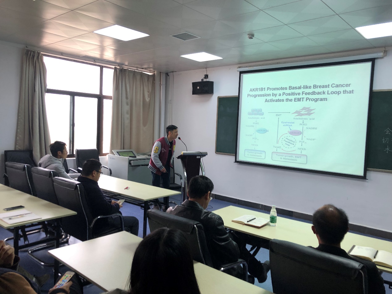 吴学标以《AKR1B1通过正向反馈激活EMT促进基底型乳腺癌的发生发展》为题,以乳腺癌的临床疾病为导向,深入浅出地阐述AKR1B1在基地型乳腺癌的基础研究中的新发现,分析药物依帕司他治疗基底型乳腺癌的可能机制,探索基底型乳腺癌的治疗靶点和靶向药物,开发新的治疗方法和思路。