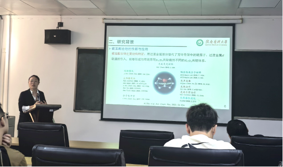 楚震威博士汇报的题目为“若干铂族金属配合物的合成及反应性研究”。主要从经典配位化学和非经典配位化学两个维度,通过研究炔烃、烯烃、偶氮等不饱和有机底物与金属源之间的化学计量反应,实现了若干铂族金属配合物的构建。