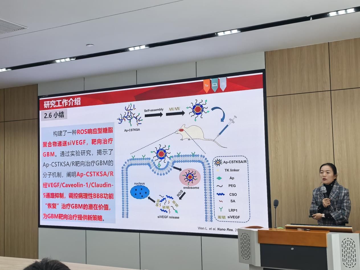 温丽娟博士以“VEGF/VEGFR通路抑制介导的病理性BBB功能恢复治疗脑部疾病研究”为题,分享其以脑胶质瘤为例,围绕VEGF/VEGFR通路,调控病理性BBB功能恢复,进行疾病靶向治疗研究。同步拓展运用至其他可能引起BBB功能破坏的脑部疾病如中风、PD等的治疗研究。