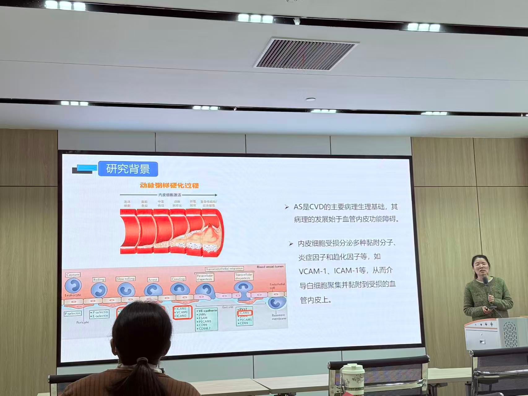 许琪博士报告的题目为“高脂状态下经糖酵解和己糖胺合成途径促动脉粥样硬化炎症的研究”,动脉粥样硬化(Atherosclerosis,AS)是心血管疾病的主要病理基础,其病理的发展始于血管内皮功能障碍。以血管内皮受损为基础产生慢性炎症的病理特征贯彻于AS始终。许博士的研究在人群中探讨了血脂、黏附分子及动脉粥样硬化风险之间的关联。同时通过动物实验,探索在高脂状态下,糖酵解代偿性增加,可通过激活HBP途径,提高黏附分子VCAM-1和ICAM-1的表达,促进炎症反应,从而导致AS的发生发展。该研究揭示了早期AS的潜在机制,为心血管疾病早期防治提供新的科学依据。