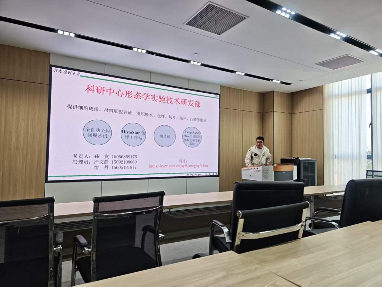 为推动开放共享,充分发挥大型仪器设备的科研支撑与教学服务效能,科研中心于4月1日下午在科技大楼112会议室举办技术平台讲座,主题是核磁共振波谱在药物研究中的应用;病理相关仪器以及全景扫描仪使用规范,分别由分子结构分析技术研发部的陈友文博士和形态学技术研发部的孙友博士主讲,康复学院、基础医学院、公共卫生与健康管理学院等相关学院的近20名师生参加了培训。