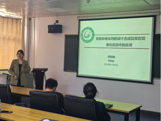欧阳露博士作了题为“双氮铱催化剂的设计合成及其在烷基化反应中的应用”的报告。围绕双氮铱催化剂的设计与开发,欧阳露博士将其应用于系列氢转移还原反应中,介绍了用于高效合成醇、胺、酮、醚类化合物的最新工作。此外,她还将发展起来的氢转移还原方法应用于烷基化反应,特别是药物结构改造。