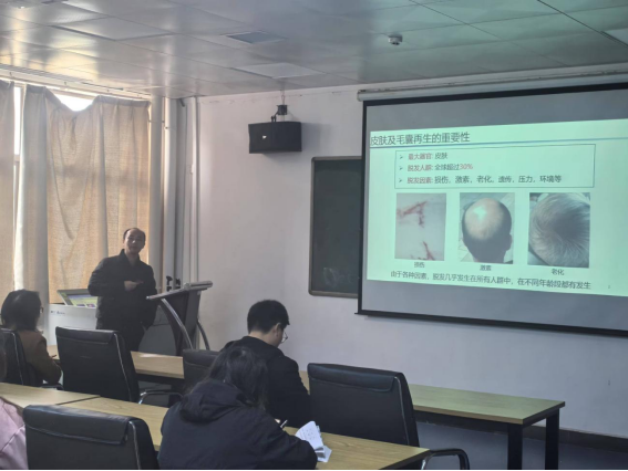 许春明报告题目为“真皮微环境与毛囊再生”。许博士首先介绍了促进毛囊再生的研究进展,其从真皮微环境角度出发,介绍了真皮微环境的组成和结构,并探究了毛囊周围真皮微环境对毛囊再生的影响机制。许博士的研究发现了一群高表达Hmmr的AnaFB细胞,对毛囊再生起到促进作用,并且其可响应细胞外基质(ECM)粘弹性的改变而激活。此外,Hmmr的唯一配体透明质酸(HA)作为ECM重要成分之一,不仅调控ECM粘弹性的改变,而且调控高表达Hmmr的AnaFB细胞,促进其与毛囊DP细胞的相互作用,调控ECM的力学微环境。总之,许博士的研究突出了ECM力学微环境对毛囊再生的作用,为毛囊再生提供了新的研究思路。