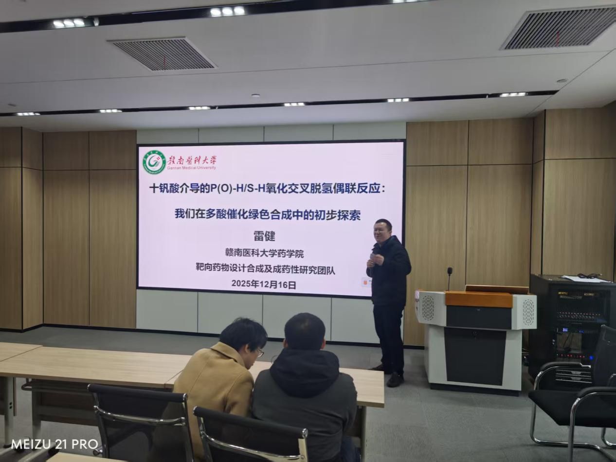 雷健博士报告的题目为“十钒酸介导的P(O)-H/S-H氧化交叉脱氢偶联反应:在多酸催化绿色合成中的初步探索”,介绍探索一种条件温和、环境友好的多酸催化新途径,以实现P(O)-S键的高效构建。通过十钒酸/空气这一温和催化体系,初步验证了多酸在推动绿色、可持续偶联反应中的潜力,以期为发展多酸催化的绿色合成提供有益参考。