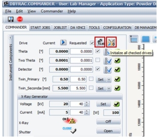 在commander界面上,勾上request,然后点击Int,对所有马达进行初始化(在每次开机时需要进行初始化,仪器会自动提醒,未初始化显示为叹号!初始化正常后显示为对勾)