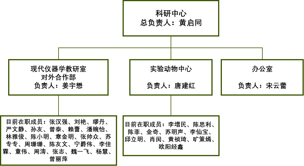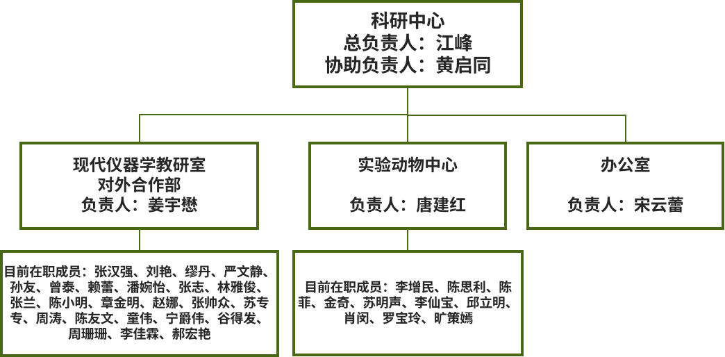 科研中心为学校正处级单位,有中心主任和副主任岗位各1个,下设办公室、现代仪器学教研室(对外合作部)和实验动物中心三个科级机构。共有管理人员30余名。